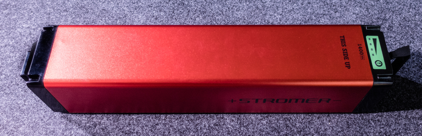Der Akku hat den selben Anschluss wie bisher, der allerdings nun exzentrisch platziert ist. Der Traggriff ist ebenfalls erhalten geblieben. Neu ist die 5-Stufige Ladestandanzeige, welche durch Knopfdruck abgefragt werden kann. Dies kommt insbesondere den Händlern entgegen - das lästige "Akku einlegen - Stromer starten" entfällt.