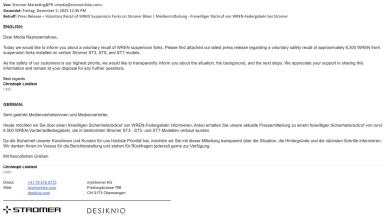 Ich bzw. mein ST7 ist auch betroffen. Ich wurde ebenso letzten Freitag von Stromer via Email informiert. Mein Händler sagte mir heute, dass die neuen Federgabeln noch nicht geliefert wurden. Somit vereinbarten wir im Januar einen Termin zu machen, nachdem die neue Gabel geliefert sein wird. Benutzen werde ich das Bike vorher nicht mehr.